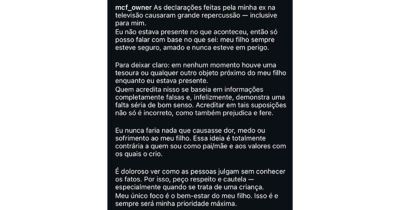 “Minha ex fez declarações que geraram enorme repercussão. Meu filho sempre esteve protegido e amado. Meu foco é só ele”, postou Maik, sem mencionar qualquer defesa à esposa.